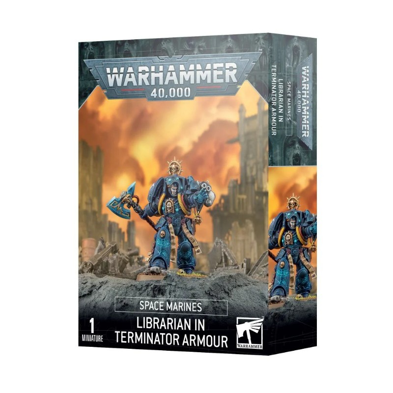 Ce kit plastique permet d'assembler un Archiviste en Armure Terminator, un redoutable psyker de son Chapitre. Il manie une arme de force, qui lui permet de concentrer son énergie mentale et prend la forme d'une hache ornementée, et le bolter Storm monté sur son poignet crache la mort sur ses ennemis. L'imposante armure de l'Archiviste est décorée du crâne cornu, symbole du Librarius. Elle est également gravée de runes protectrices et surmontée d'une coiffe psychique qui aide le porteur à repousser la sorcellerie ennemie.