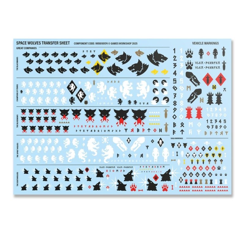 Ce kit est composé de 129 éléments en plastique, de 5x Socles Ronds Citadel de 40mm et de 1x Planche de Décalcos des Space Wolves proposant 419 décalcos de grande qualité pour décorer vos figurines.