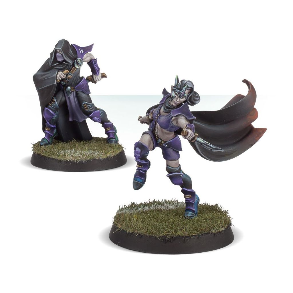 Ce kit en résine en plusieurs parties contient les composants nécessaires à l'assemblage de 2 Assassins Elfes Noirs, à utiliser dans votre équipe Elfes Noirs Blood Bowl. Les deux modèles sont vêtus de la parure élégante vers laquelle les assassins ont tendance à graviter - l'un d'entre eux est presque complètement caché par la cape, la capuche et le masque qui recouvrent son armure légère, l'autre est un peu plus libre, sa cape se déployant derrière lui et son visage étant visible sous un casque métallique. Les deux modèles tiennent des couteaux à l'allure redoutable - bien sûr, ce sont des assassins !