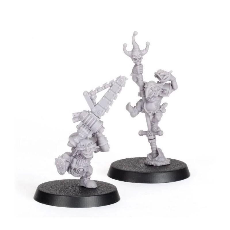Description du produitNobbla Blackwart et Scrappa Sorehead sont d'excellents exemples de ce qu'un peu d'ingéniosité et un manque total de préservation de soi peuvent faire pour une partie de Blood Bowl. Nobbla est sans aucun doute un fou sadique, qui utilise sa tronçonneuse pour massacrer ses adversaires de la manière la plus flagrante possible. Scrappa est considéré comme assez intelligent pour un gobelin, car il utilise son bâton de saute-mouton "fantaisie" pour sauter en l'air et attraper une balle lancée.