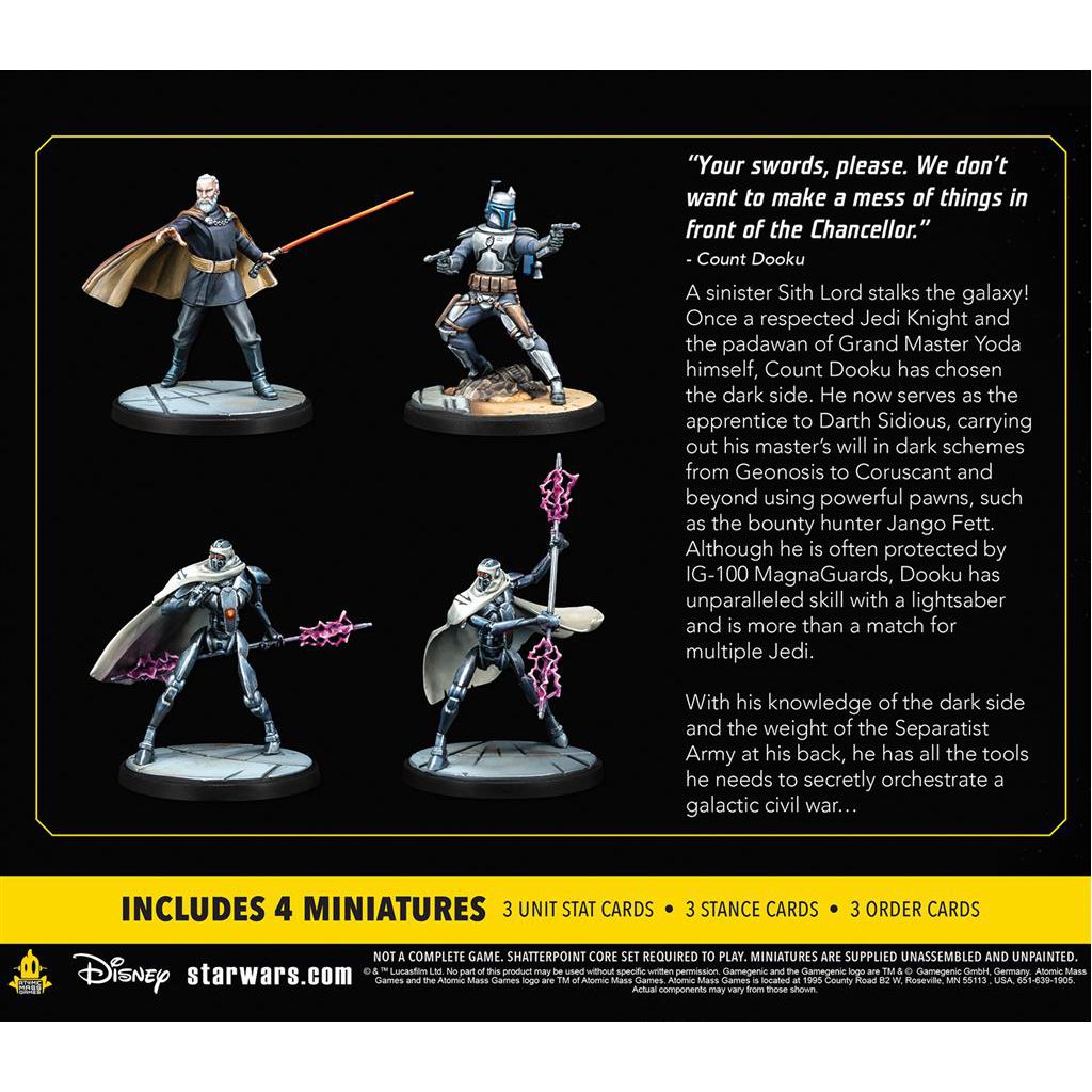 Ce set ajoute à Star Wars : Shatterpoint une nouvelle escouade composée du Comte Dooku, de Jango Fett et de 2 Magna Gardes IG-100 que les joueurs peuvent jouer immédiatement ou utiliser avec d’autres personnages pour créer leur propre escouade.