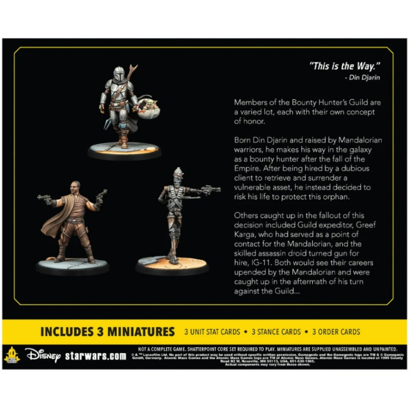 Le pack d'escouade de la guilde certifiée amène le Mandalorien dans le jeu en tant qu'unité principale aux côtés de Greef Karga en tant qu'unité secondaire et du droïde assassin IG-11 en tant qu'unité de soutien. Ces personnages peuvent former une escouade complète à eux seuls ou être associés à d'autres personnages pour former une escouade entièrement personnalisée.