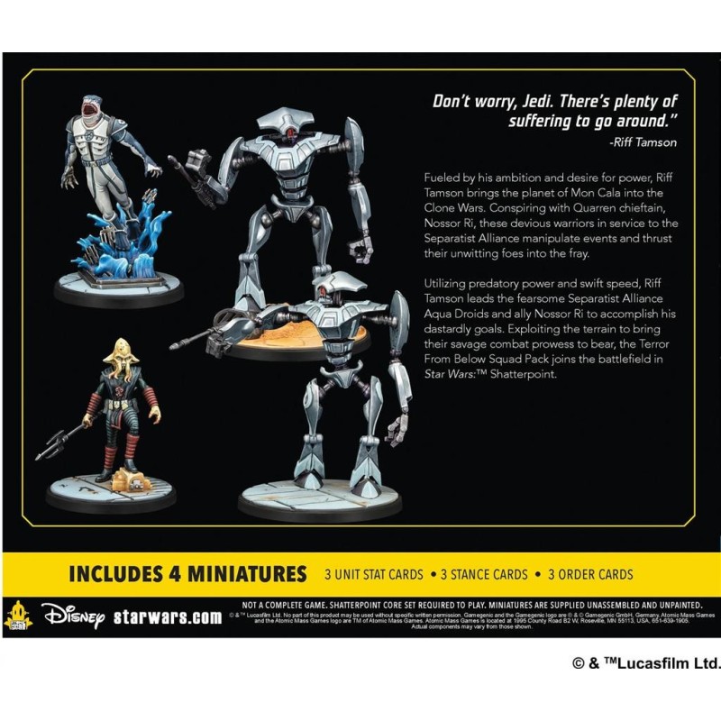 Description du produitAnimé par une ambition démesurée et un fort désir de pouvoir, Riff Tamson plonge la planète Mon Cala dans la Guerre des Clones. Conspirant avec le chef des Quarren, Nossor Ri, ces guerriers sournois au service de l’Alliance Séparatiste manipulent les événements et poussent leurs ennemis au cœur de la mêlée à leur insu.