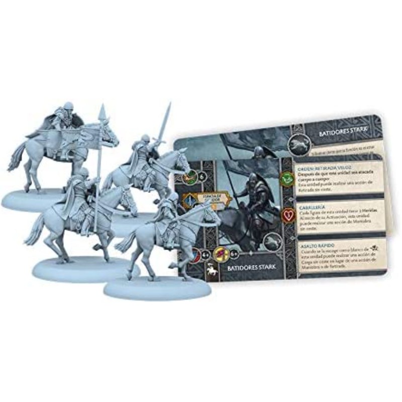 Description du produitBien qu’ils ne soient pas équipés pour de longs corps à corps, les Cavaliers de la Maison Stark se retrouvent rarement en mauvaise position. Ils se caractérisent par une mobilité sans pareille, grâce à leurs armures légères et leurs chevaux non bardés, entraînés à conserver leur calme et à galoper. À l’instar de la plupart des troupes légères, les Cavaliers sont vulnérables aux flèches, ce qui fait des archers leur proie naturelle. Ils peuvent fondre sur eux et balayer leurs rangs en un éclair.