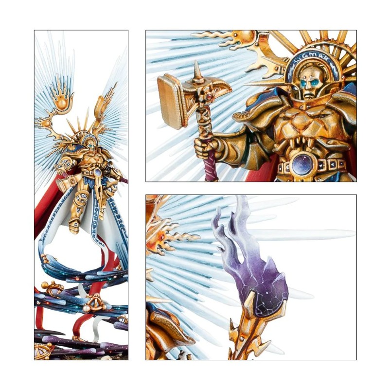 Description du produitLa colère du Dieu-Roi. L'Ange Vengeur d'Azyr. Le Porteur du Marteau Monde. Le Premier Fils de Sigmar - tel est le Celestant-Prime. Grand roi et défenseur des hommes au temps de sa vie de mortel, il a été prodigieusement galvanisé par la puissance divine de Sigmar; et pourtant, ce don de pouvoir ne s'arrête pas là. Désormais nanti du Fendeur de Crânes, le Grand Broyeur Ghal Maraz, le Celestant-Prime rugit de fureur à travers les champs de bataille des Royaumes, tel un appel aux armes retentissant. L'impact fracassant de Ghal Maraz peut tuer net un démon, bannissant son esprit vers le Royaume du Chaos.