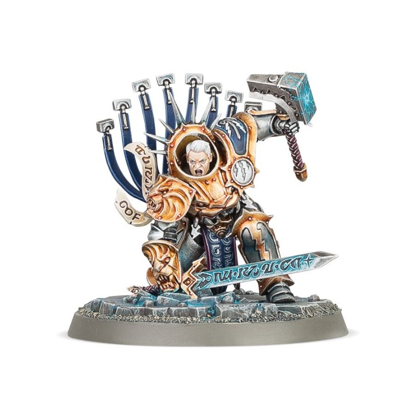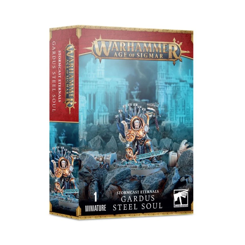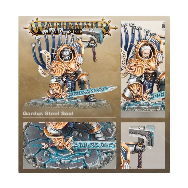 Gardus Steel Soul sait tout aussi bien encadrer ses Hallowed Knights que faucher les ennemis de l'Ordre en combat rapproché, aussi n'ayez pas peur de l'envoyer dans la mêlée. Il est représenté en train de toucher terre après avoir été projeté d'Azyr sur un éclair de Sigmar, et sa cape de guerre traduit la force de l'impact, comme sur la couverture du roman Black Library Hallowed Knights: La Pyramide Noire. Cette figurine stupéfiante peut être assemblée avec ou sans heaume.