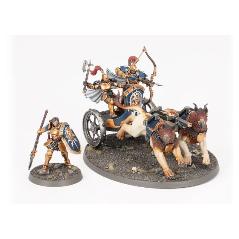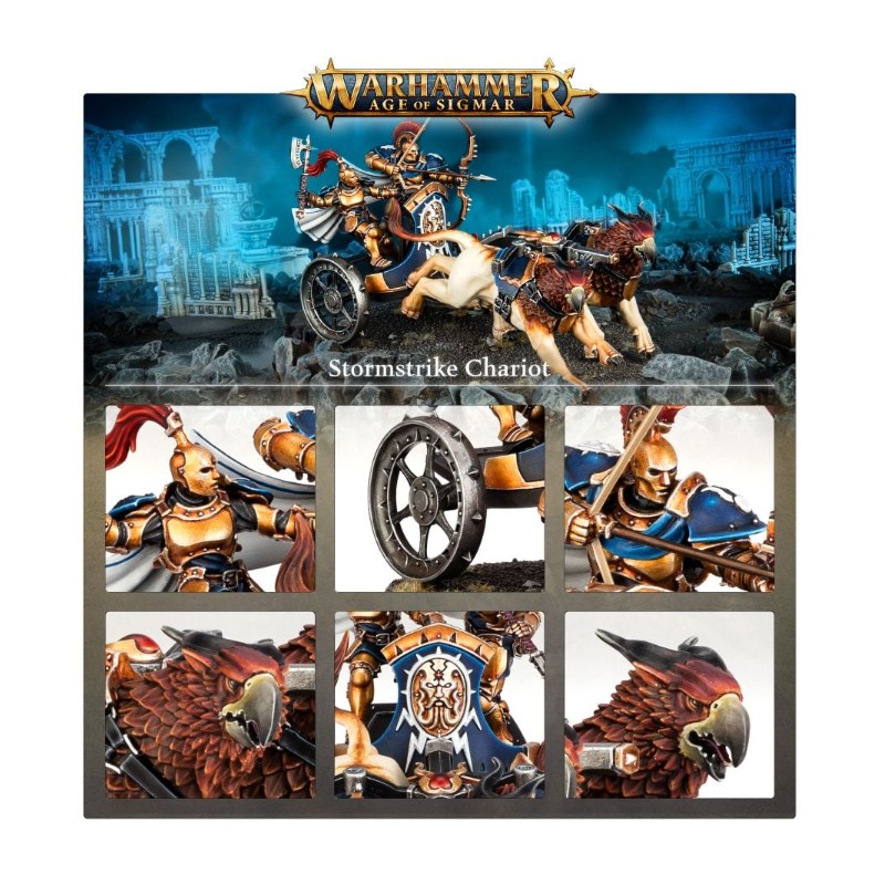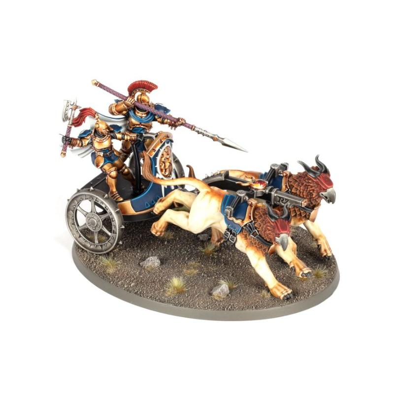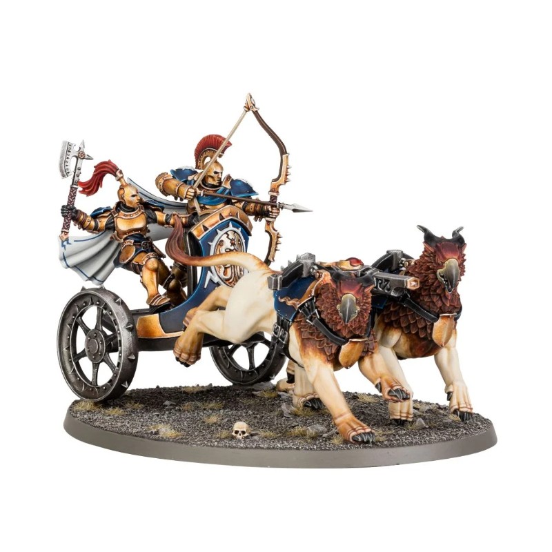 Description du produitLes Chars Foudroyeurs sont les briseurs de ligne attitrés des Éternels. Tirés par par une lignée spéciale de gryph-destriers, ces chars sont assez rapides pour esquiver les tirs adverses, et ripostent par de puissantes charges ou un appui à distance tempétueux.