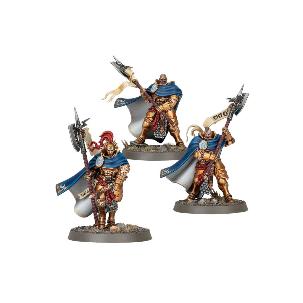 Ce kit à emboîter se compose de 29 pièces, avec lesquelles vous pouvez assembler trois Praetors en armure fulgurante et cape volante, chacun armé d'une hallebarde de garde des âmes. Chaque figurine peut avoir un casque ou être tête nue.