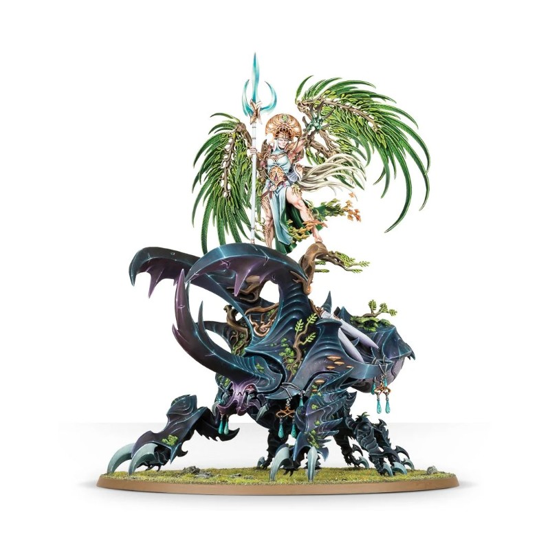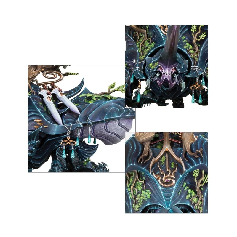 Ce kit plastique contient toutes les pièces nécessaires pour assembler Alarielle the Everqueen, sur son gigantesque Wardroth Beetle – un bélier de siège vivant couvert de mousse et de champignons, et orné d'amphores d'âmes et autres pierres gravées. Elle brandit la Lance de Kurnoth, et son bras gauche s'achève par l'effroyable Serre du Déclin. Il y a en tout 79 composants, plus un imposant socle rond Citadel de 160mm.