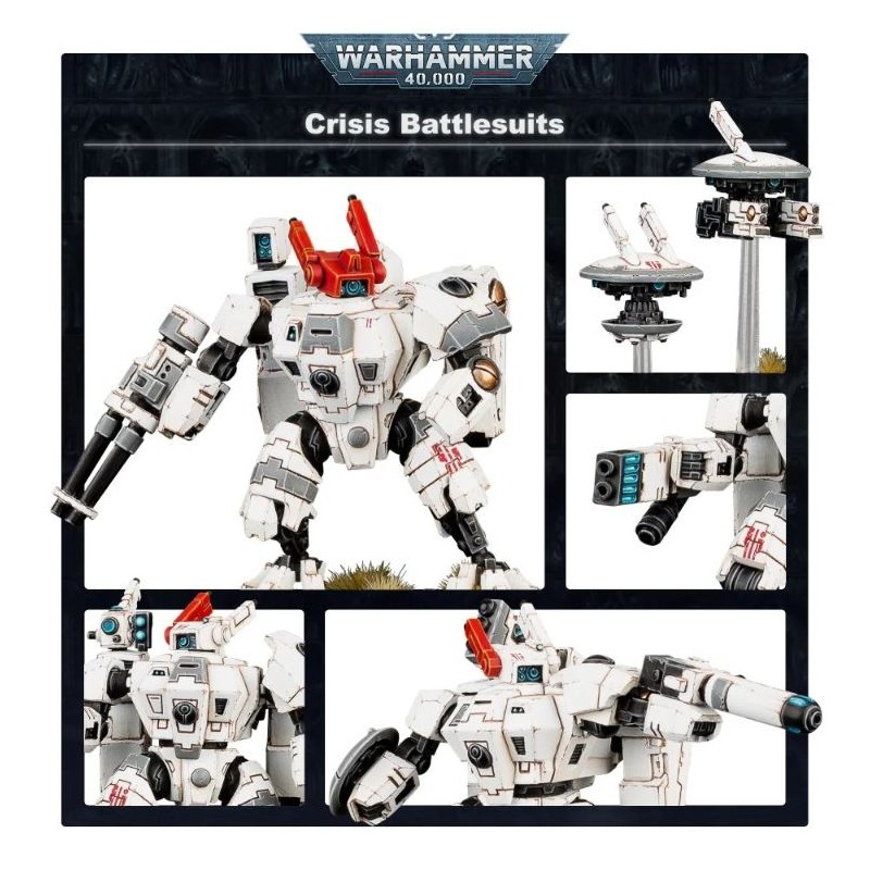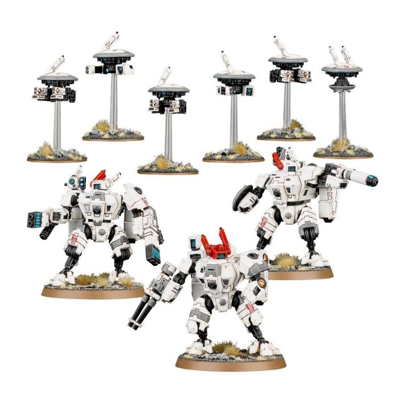 Ce kit plastique contient tout le nécessaire pour assembler trois XV8 Crisis Battlesuits, accompagnées de six drones. Le tout offre d'impressionnantes possibilités de personnalisation, avec des articulations sphériques pour maximiser le choix des poses. Une des figurines peut être montées en tant que Shas'vre, avec une tête et un pectoral spéciaux, et la boîte fournit un arsenal avancé T'au prodigieux: quatre fusils à plasma, trois lance-flammes, quatre éclateurs à fusion, quatre canons à induction, trois nacelles de missiles et trois générateurs de boucliers. Les six drones d'escorte peuvent être montés sous forme de variante Gun, Shield ou Marker, jusqu'à trois pouvant être du même type. Le kit contient en outre un assortiment de systèmes électroniques pour exo-armure. Une des figurines du kit peut même être assemblées sous forme de XV8-02 Crisis Battlesuit expérimentale de classe Iridium, reconnaissable à son blindage plus épais et à son allure agressive. Une variété considérable!
