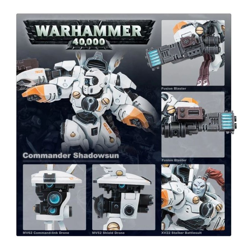 L'exo-armure de Shadowsun, à la pointe du progrès, est équipée d'un lance-fléchettes, de deux éclateurs à fusion haute puissance (chacun remplaçable par un éclateur à fusion dispersée), une nacelle de missiles légère et un pistolet à impulsions. Elle est par ailleurs accompagnée d'un MV37 Advanced Guardian Drone et d'un MV62 Command-link Drone.