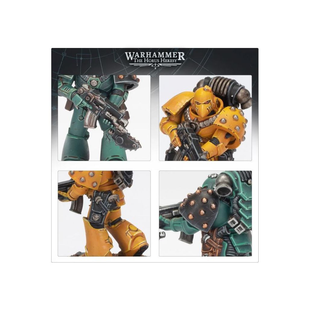 Les Légionnaires Space Marines en armures énergétiques MkII incluent des éléments pour pouvoir assembler des Sergents et des Légionnaires avec nuncio-vox, scanner augure ou vexillum optionnels. Les Sergents ont chacun le choix entre trois têtes et options d'armement. Les Légionnaires avec bolter peuvent recevoir une baïonnette ou une baïonnette tronçonneuse optionnelle, et les têtes et accessoires – ce qui inclut des grenades, des holsters de pistolets et des étuis – sont interchangeables entre les figurines. Cette boîte contient aussi un set d'armes désintégratrices afin que vous puissiez promouvoir votre infanterie en Escouades de Vétérans Tactiques pourvus de cet arsenal dévastateur.
