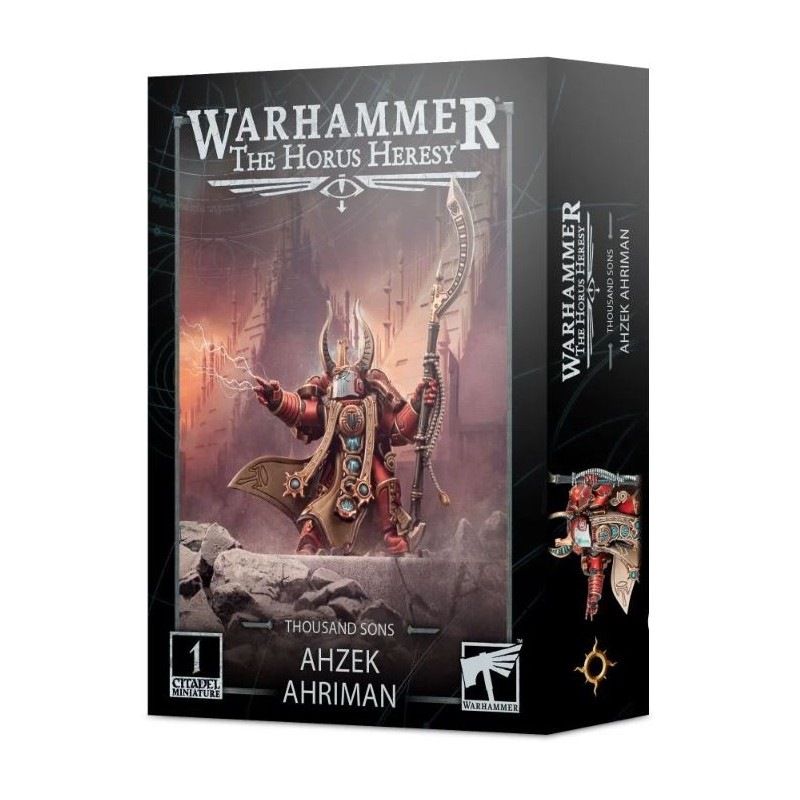 Ce kit plastique permet d'assembler un Ahzek Ahriman, Maître Archiviste des Thousand Sons. Armé de son élégant bâton de force, le Sceptre Corvidae, et paré des talismans occultes et de la symbologie de la XVᵉ Légion, Ahriman est un puissant psyker qui se rend au combat crépitant d'énergie surnaturelle. En tant que maître du culte des devins Corvidae, Ahriman use de ses pouvoirs prophétiques pour guider ses alliés sur le champ de bataille. En conjonction avec ses aptitudes d'officier de terrain et de combattant au corps à corps, cela fait de lui un élement central tout trouvé pour une armée de Thousand Sons à Warhammer: The Horus Heresy.