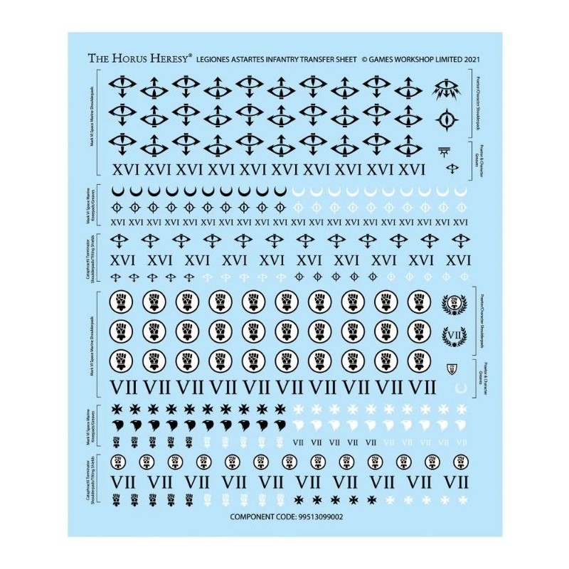 Cette figurine ne comporte pas de marquage de Légion, pour permettre aux hobbyistes de Warhammer de la peindre à leur guise. Ceci dit, la boîte contient une planche de décalcomanies avec 42 marquages optionnels et de l'iconographie pour les Légions des Sons of Horus et des Imperial Fists.