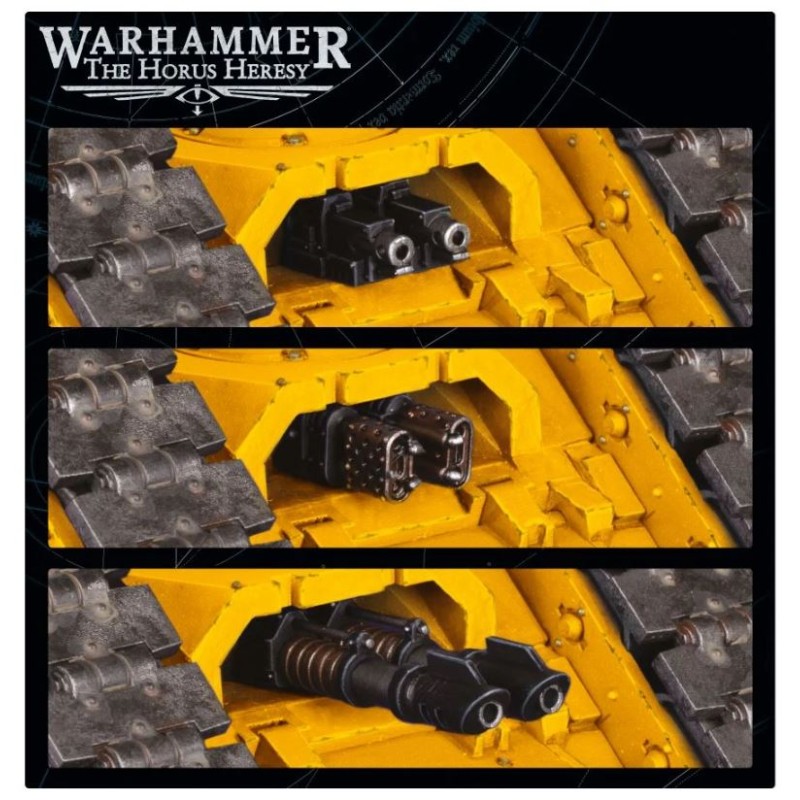 Ce set est constitué de 159 composants en plastique, et est fourni avec 1x Planche de décalcomanies de Véhicules Legiones Astartes avec 44 marquages et icônes des Légions des Sons of Horus et des Imperial Fists. Cette figurine est fournie non peinte et nécessite assemblage.