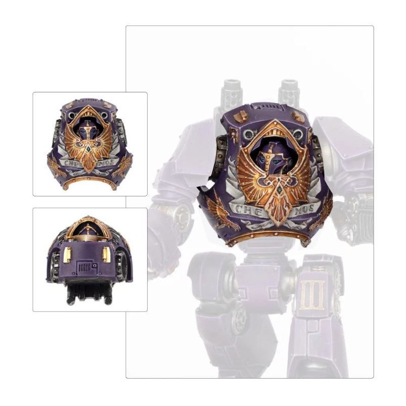 Ce kit d'amélioration permet de personnaliser un cuirassé Contemptor avec une nouvelle tête et un nouveau torse en résine, sur le thème de la Légion des Enfants de l'Empereur. La tête a une apparence phénicienne distinctive, tandis que le torse arbore une Aquila Palatine ornée - l'honneur exclusif de la IIIe Légion - ainsi que des éléments tels que des volutes décoratives, un capuchon cannelé et l'armure à griffes ailées de la Légion. Il est parfait pour ajouter le look classique de la IIIe Légion à vos puissants Dreadnoughts Contemptor.