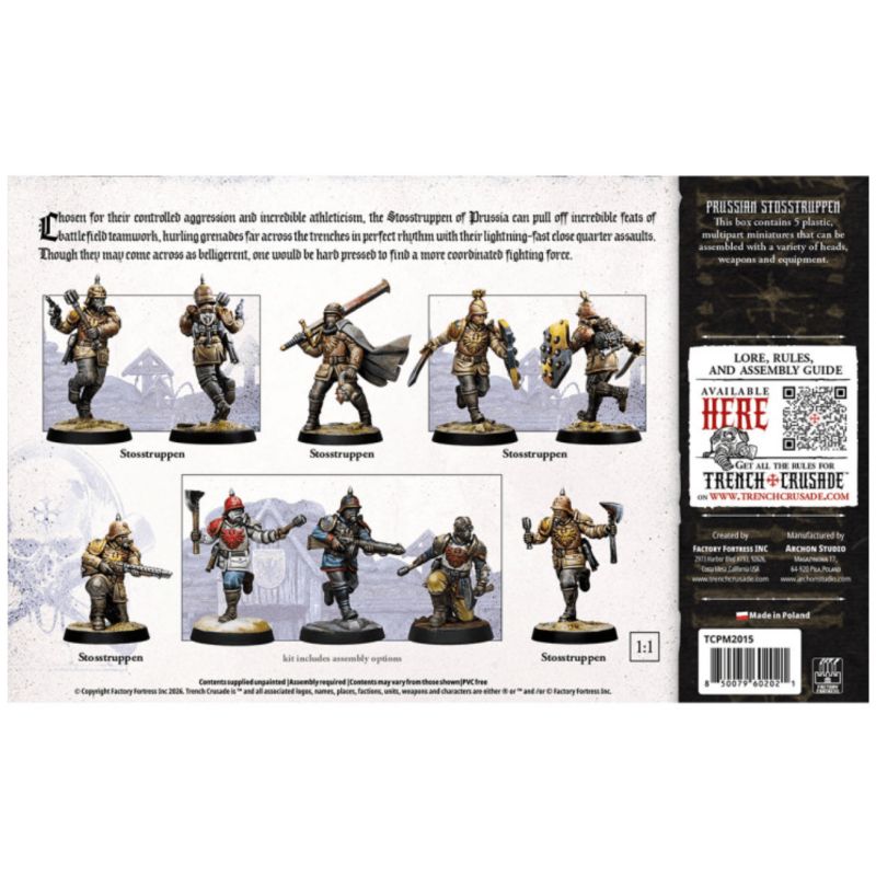 Description du produitChoisis pour leur agressivité maîtrisée et leur incroyable athlétisme, les Stosstruppen de Prusse sont capables d'exploits incroyables en matière de travail d'équipe sur le champ de bataille, lançant des grenades loin au-delà des tranchées en parfaite synchronisation avec leurs assauts rapides comme l'éclair au corps à corps. Bien qu'ils puissent sembler belliqueux, il serait difficile de trouver une force de combat plus coordonnée.