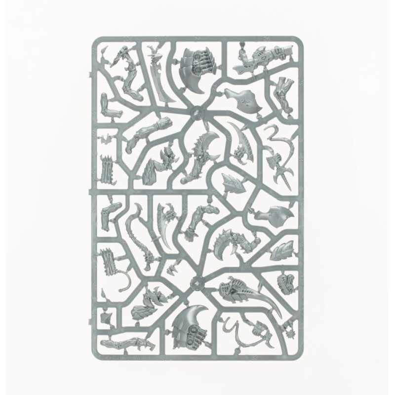 Les Gardes Tyranides peuvent être armés de pinces broyeuses, de griffes tranchantes, ou d'un hachoir d'os et d'un bioknout. Les têtes, corps, queues, jambes, bras et armes sont interchangeables entre toutes les figurines, ce qui vous permet de déchaîner votre Esprit-ruche profond au moment de les assembler. Ils peuvent autrement être assemblés comme des Gardes des Ruches, armés au choix d'un canon empaleur ou d'un canon choc.