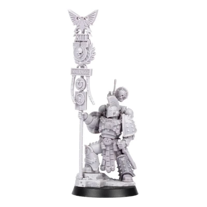 Ce kit en résine de 15 pièces en plusieurs parties construit un Remus Ventanus à utiliser dans les jeux de The Horus Heresy. Sa belle armure regorge de détails emblématiques des Ultramarines, de la crête de son casque à motif prétorien à son épée énergétique de style gladius. La norme de la Légion est difficile à manquer, et il est également équipé d'une unité Nuncio-vox montée sur son bloc d'alimentation. Ventanus peut être assemblé avec ou sans son casque orné.