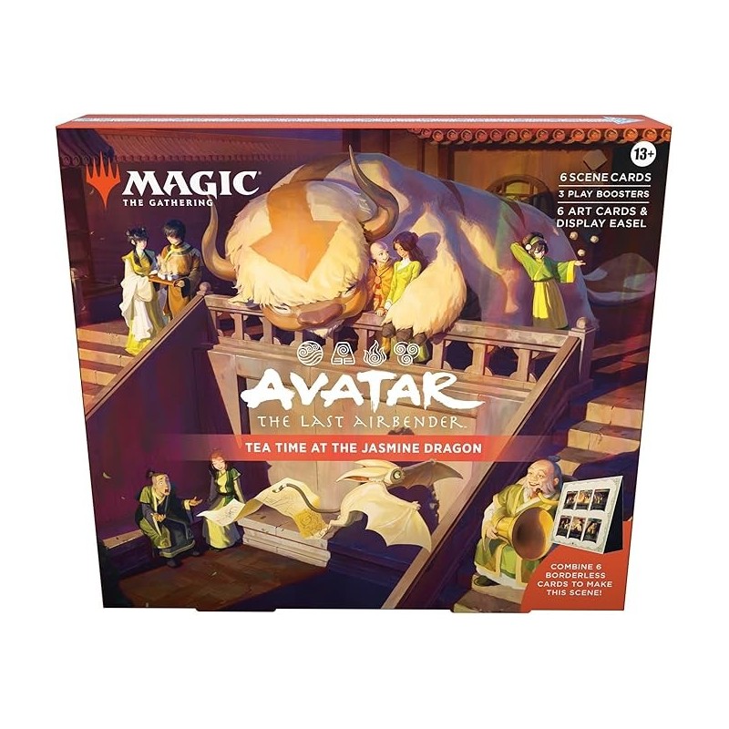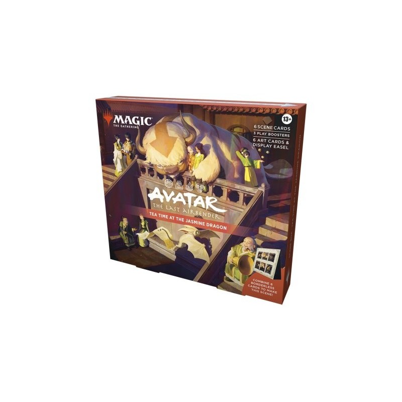 Ces boîtes scéniques Magic: The Gathering | Avatar, le dernier maître de l’air, contiennent 6 cartes scéniques sans bordure Premium traditionnelles, 6 cartes d’illustration, 3 boosters de jeu et un chevalet de présentation en papier.
