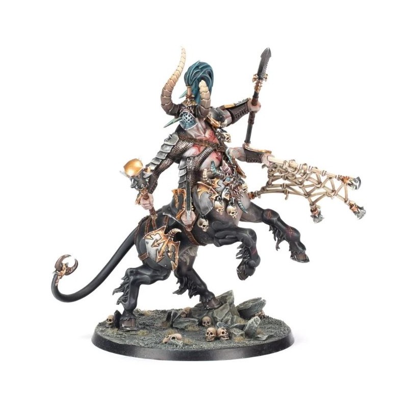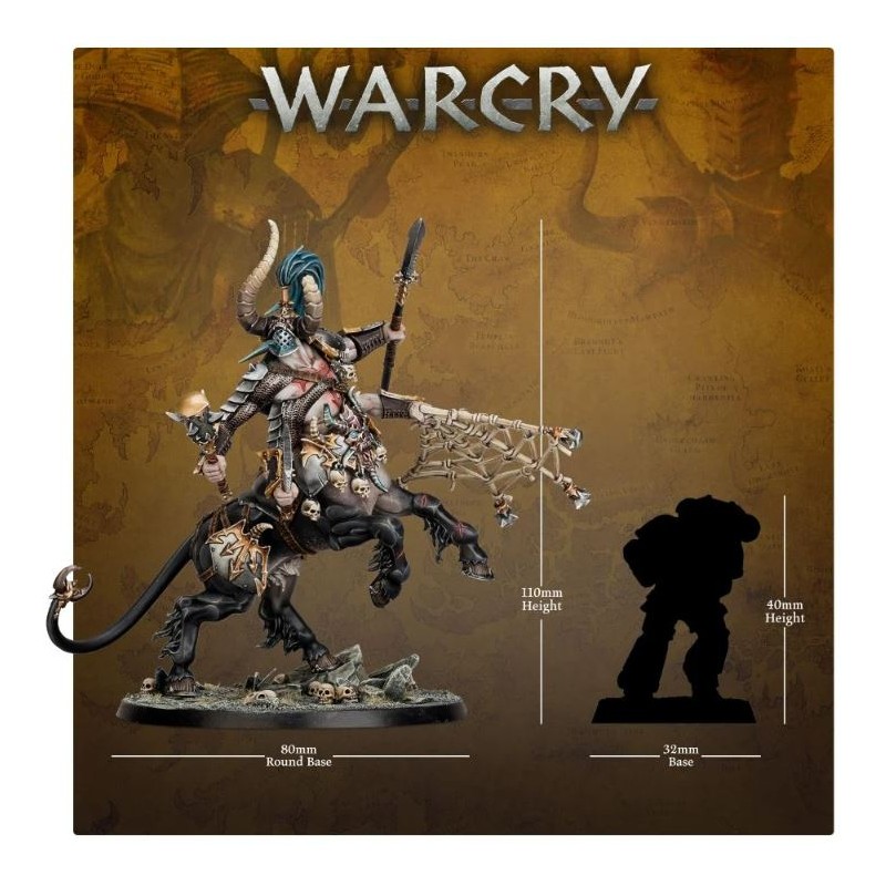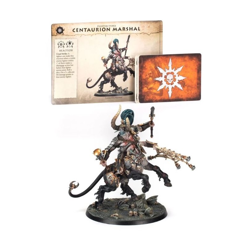 Ce kit plastique permet d'assembler un Maréchal Centaurion, un gigantesque guerrier à huit membres et maniant toute une panoplie d'armes. Cabrant sur ses jambes arrière, sa queue et son cimier flottant derrière lui, cette figurine est un ajout impressionnant à une collection du Chaos, et le style gladiateur de son armure s'accorde parfaitement aux autres résidants des fosses de combat d'Archaon, comme les Légionnaires du Chaos qui partagent sa vénération de Be'lakor. Le Maréchal Centaurion peut se joindre à n'importe quelle bande du Chaos dans les parties de Warcry, à l'aide des cartes de combattant et d'aptitudes comprises dans la boîte, ou être aligné comme un puissant Héros dans les armées d'Esclaves des Ténèbres dans les parties de Warhammer Age of Sigmar.