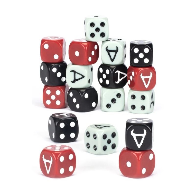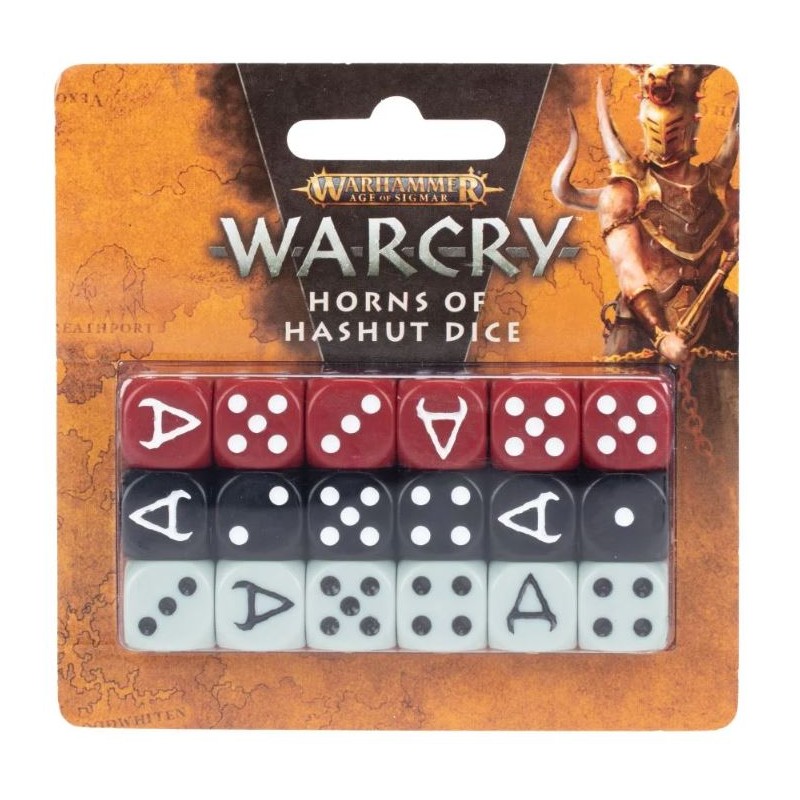 - 18 dés colorés de 16 mm de côté, avec un symbole des Cornes de Hashut sur la face 6