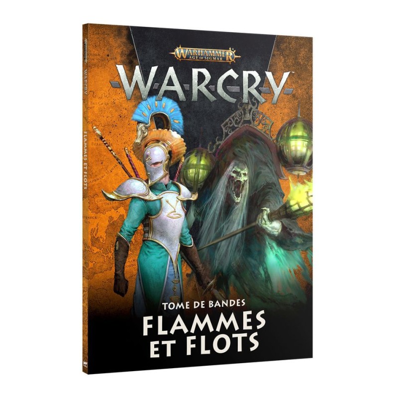 – Le Tome de Bande: Flammes et Flots broché de 64 pages: présente de l'historique, des illustrations, des règles, des quêtes et des campagnes pour les deux bandes de la boîte, ainsi que pour le nouveau terrain d'Idole des Anciens