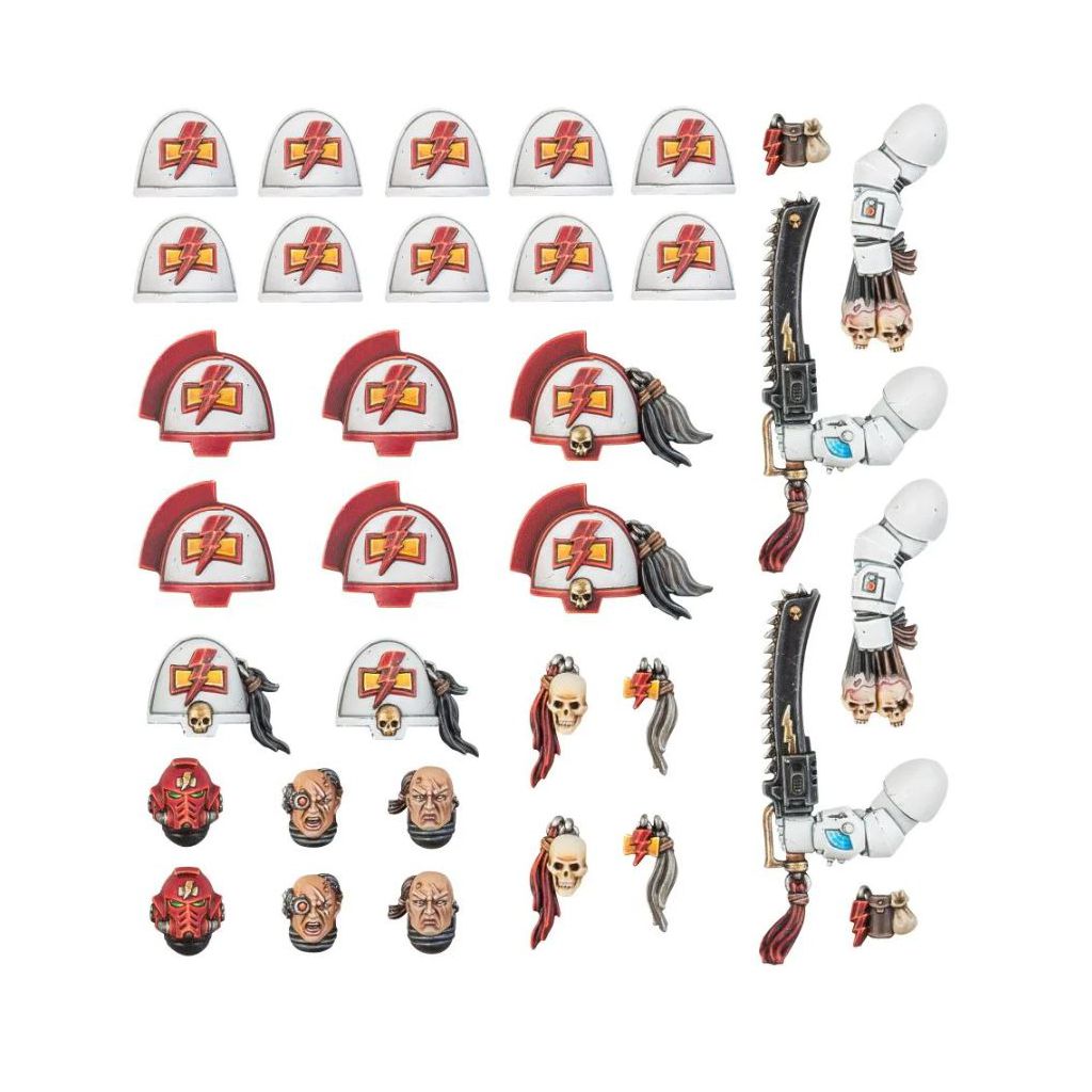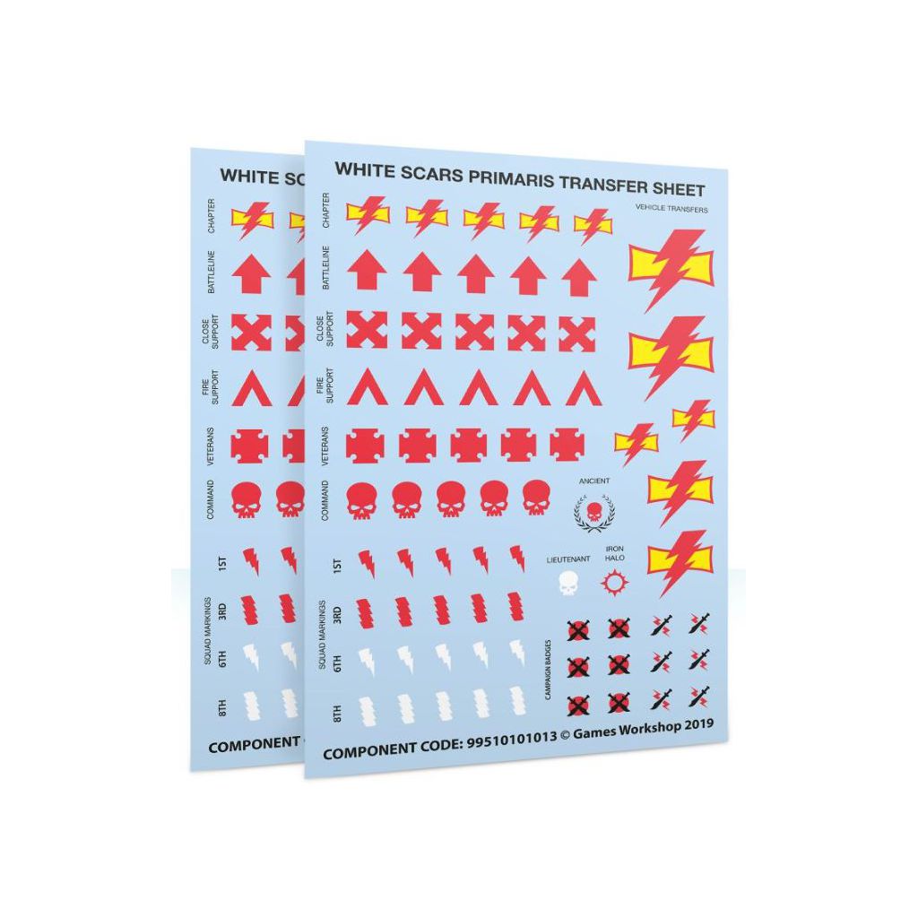 – Planche de décalcomanies avec marquages de Chapitre, d'escouade et de véhicule, plus des insignes de campagne, des numéros d'escouade, et des marquages honorifiques ou hiérarchiques.