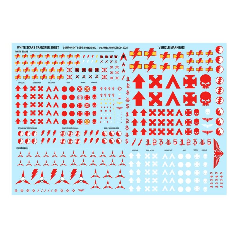 Ce kit est fourni avec une toute nouvelle Planche de Décalcos des White Scars qui propose 407 décalcos de grande qualité, dont des icônes du Chapitre des White Scars, des marquages de rôles de bataille, des numéros et des inscriptions. Elle propose également de l'iconographie pour les Confréries de la Tête de Lance, du Poing de Feu et de l'Aigle, ainsi que pour le Chapitre successeur des Storm Lords.