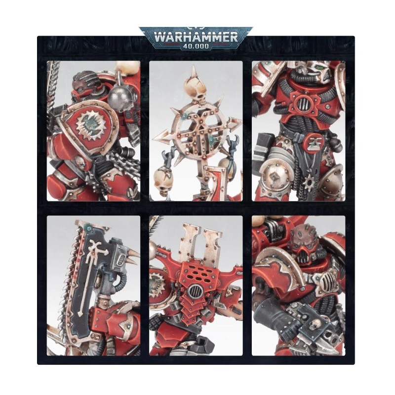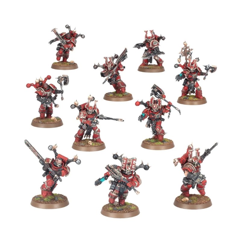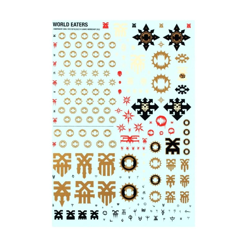 Ce kit est composé de 141 éléments en plastique et est fourni avec 10x socles ronds Citadel de 32 mm. Vous trouverez également une Planche de Décalcos World Eaters avec 200 motifs représentant des symboles de Khorne, des tatouages runiques, des étoiles à huit branches, des crânes et diverses versions de l'icône des World Eaters. Ces figurines sont fournies non peintes et nécessitent assemblage