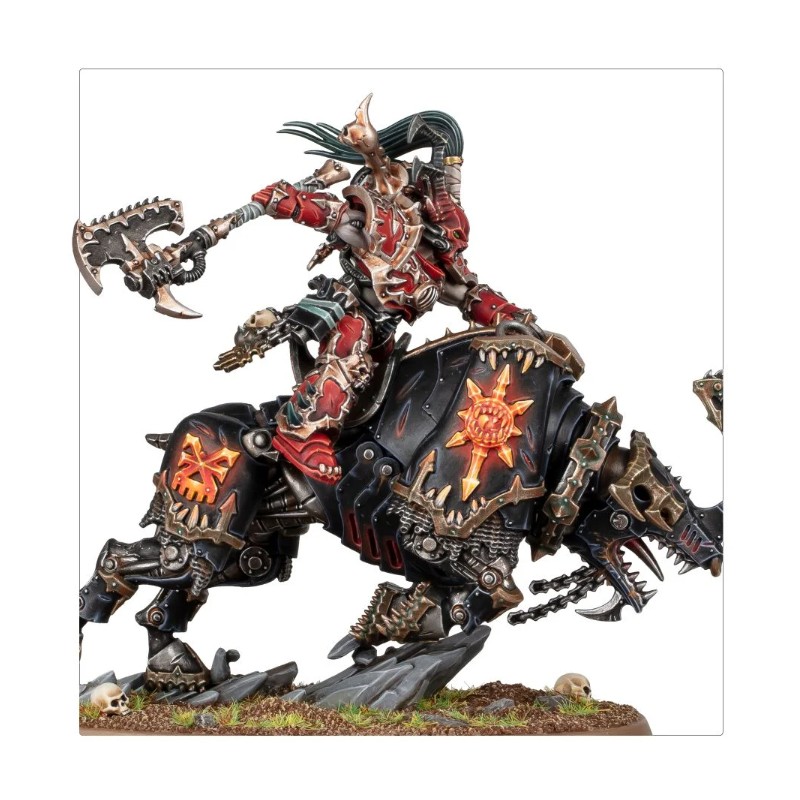 - Se rend au combat sur le dos d'une monture démon de Khorne, armé d'une lame tronçonneuse et d'un pistolet à plasma