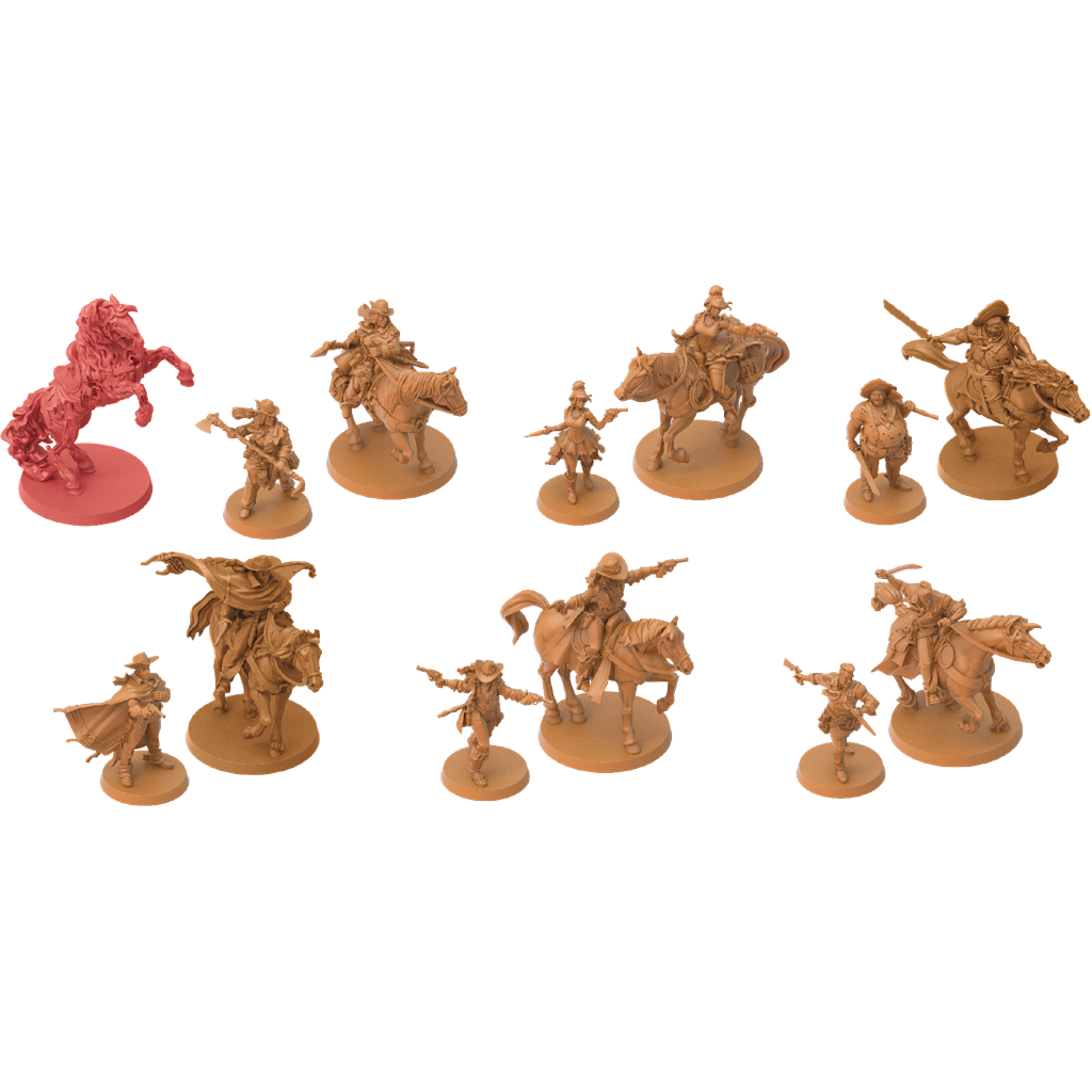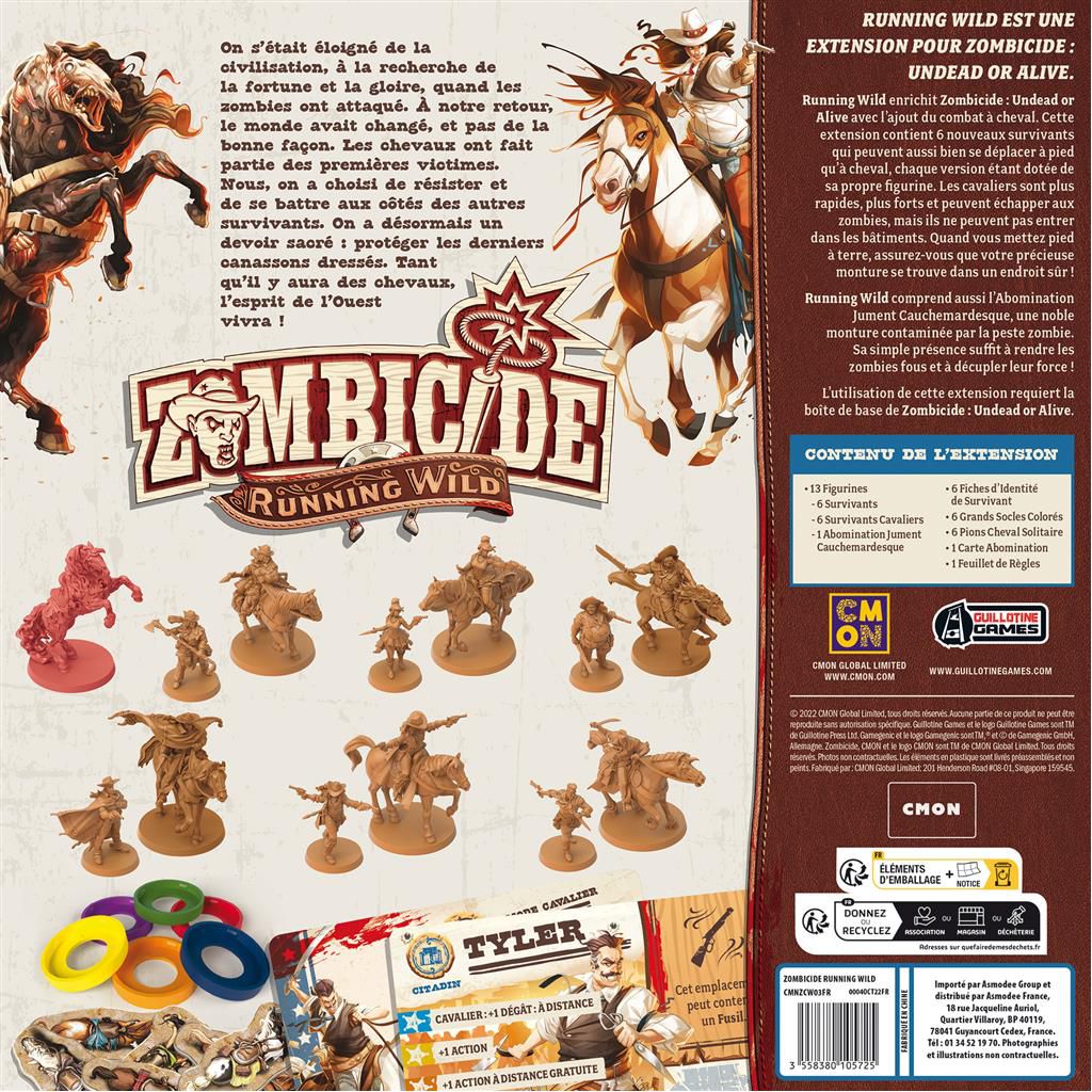 Running Wild est une extension pour Zombicide : Undead or Alive. Elle permet l’ajout du combat à cheval. Cette extension contient également 6 nouveaux survivants qui peuvent aussi bien se déplacerà pied qu’à cheval, chaque version étant dotée de sa propre figurine. Les cavaliers sont plus rapides, plus forts et peuvent échapper aux zombies, mais ils ne peuvent pas entrer dans les bâtiments. Quand vous mettez pied à terre, assurez-vous que votre précieuse monture se trouve dans un endroit sûr !